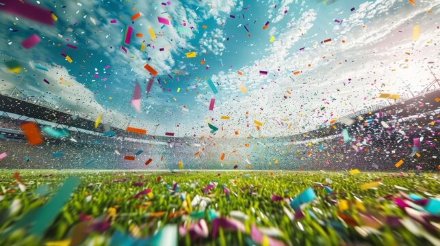 A sports stadium filled with confetti falling on the green field, under a bright sky with a cheering crowd