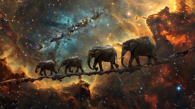 A family of elephants traversing a bridge made of stars connecting two parts of a nebulous cloud