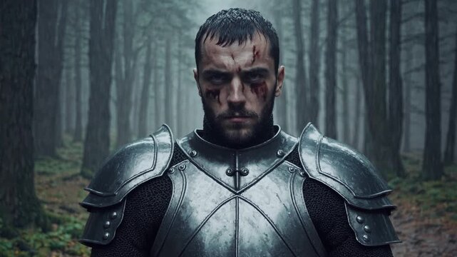 Determined Knight Braving Stormy Forest Backdrop, Perfect for HighEnergy Campaigns or Epic Fantasy Projects Inspiring Perseverance and Courage.