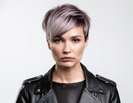 Woman portrait with short hair wearing biker black leather jacket looking serious face on white background