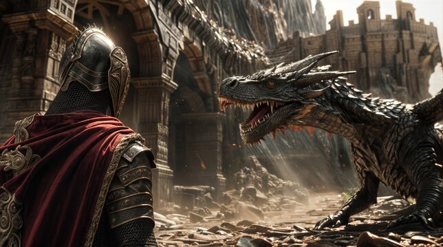 A formidable knight in shining armor confronts a fearsome dragon amidst the ancient cityscape, the monstrous creature poised with razor-sharp teeth and immense wings.