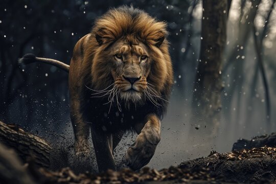 King of the Jungle. Witness the intense action of a wild lion in the jungle, showcasing its fearsome and majestic presence as the undisputed king of the savanna