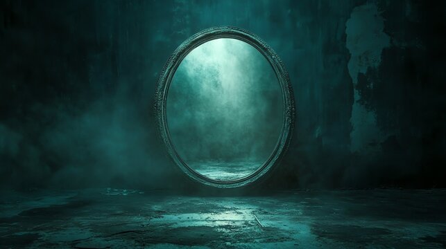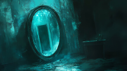 Enchanted mirror glowing with eerie light, fearsome reflections of twisted realities, magic and dread intertwined. Whispering Mirrors. Illustration