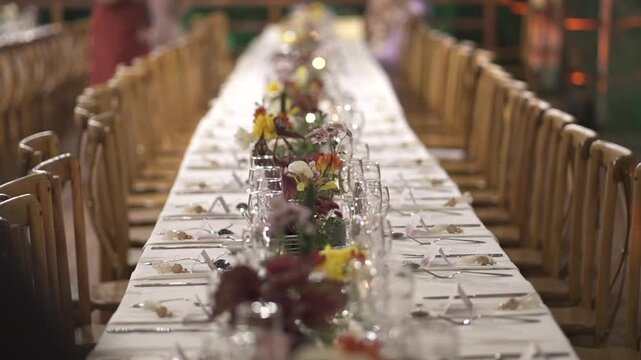 Elegant long dinner table set with candles and flowers prepared for wedding celebration.