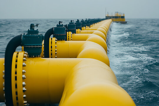 Offshore Infrastructure: Yellow pipes with valves traversing the sea, leading to a platform. Engineering feat merging with the horizon.