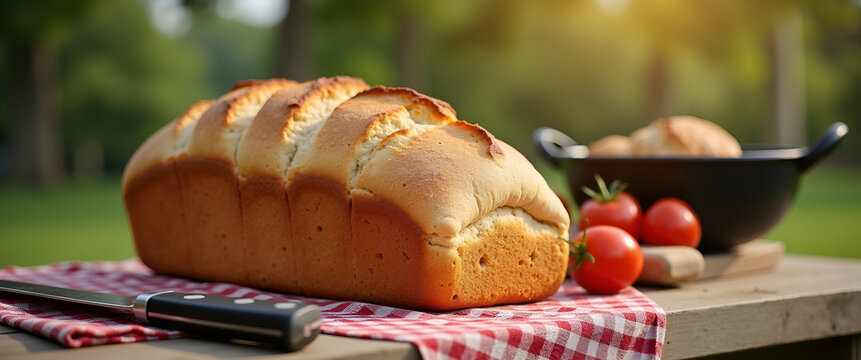 A freshly baked loaf of bread featured prominently on a picnic table, surrounded by barbecue items, with a significantly spacious background perfect for advertising purposes.