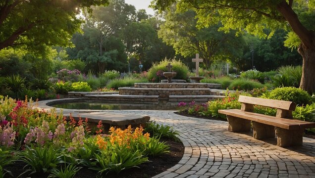 Serene outdoor garden retreat featuring lounge chairs sofa and tranquil water fountain
