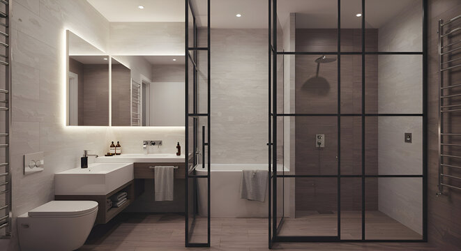 Modern bathroom with neutral tones featuring a glass shower enclosure with metal framing. Clean, minimalist design with a vanity, bathtub and toilet.