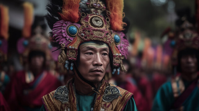 Cap Go Meh Festival (Tatung Parade) in Singkawang, Indonesia on February 12, 2025, colorful Tatung performers adorned with elaborate traditional costumes and intricate face paint