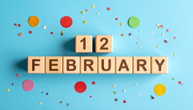 Wooden Blocks with Date 12 February. Calendar for birthday or anniversary on solid colored background with confetti
