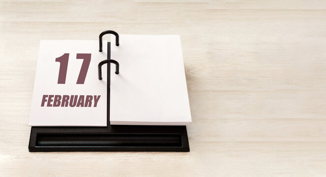 february 17. 17th day of month, calendar date.  Stand for desktop calendar on beige wooden background. Concept of day of year, time planner, winter month