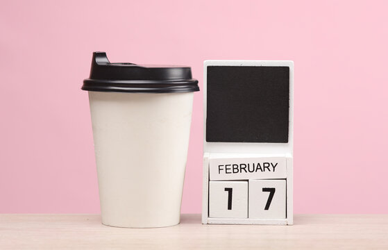 White wooden block monthly calendar with the date february 17 and coffee cup on the table, pink background. Planning, business concept