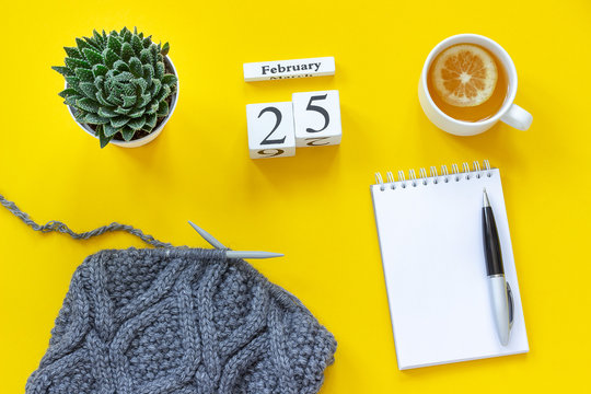 Cube shape calendar for February 25 on wooden surface with empty space for text