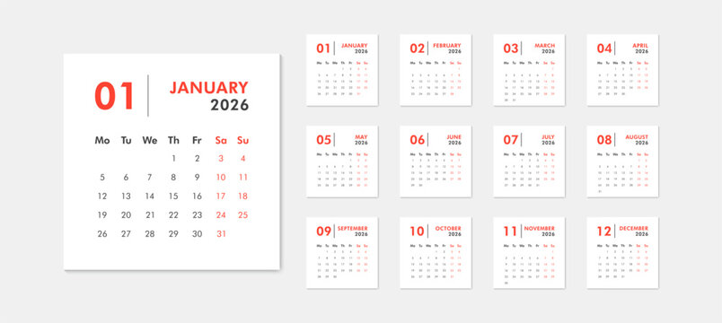 Calendar 2026. Week starts Sunday. Office corporate design monthly 2026 calendar template vector.