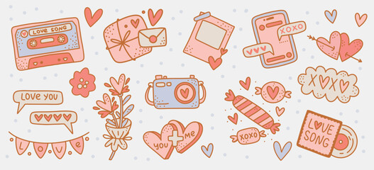 Valentine's Day Clip arts Set: Vector Collection of Love Themed Stickers. Isolated Romantic elements with Hearts, Music Tape, and Sweets for Journal Stickers, Scrapbooking, and Greeting Cards