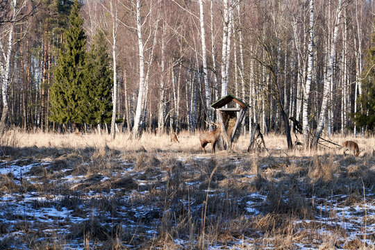A group of spotted deer at a feeding trough in the early spring morning. The horns of an adult male sparkle in the sun, emphasizing his strength and greatness
