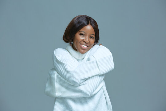 Happy positive african american young girl embrace herself feel self love, smiling. Body acceptance, good self esteem