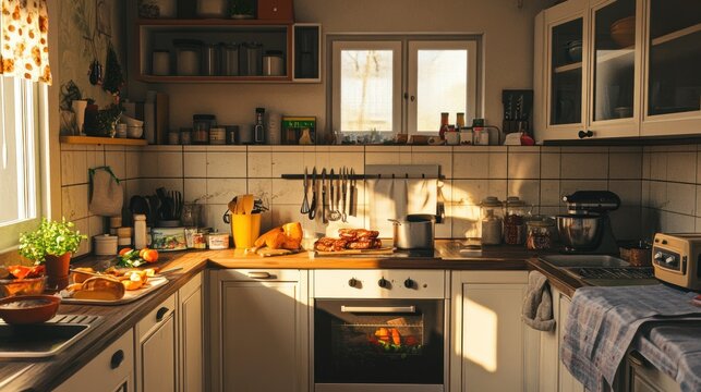 A kitchen with an organized pantry, with jars of ingredients, spices, and a clean, satisfying feel