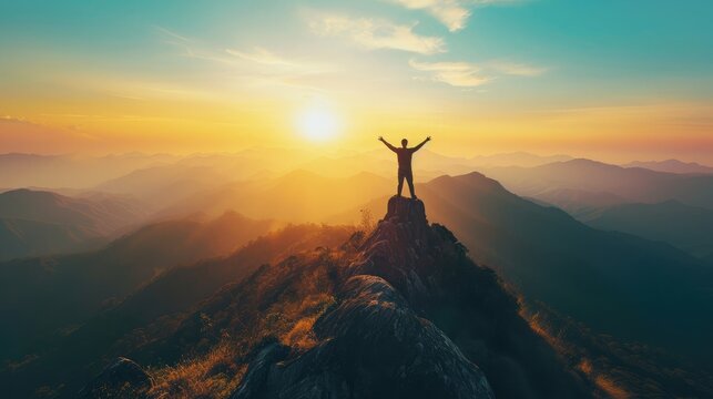Copy space of man rise hand up on top of mountain and sunset sky abstract background. Freedom and travel adventure concept.