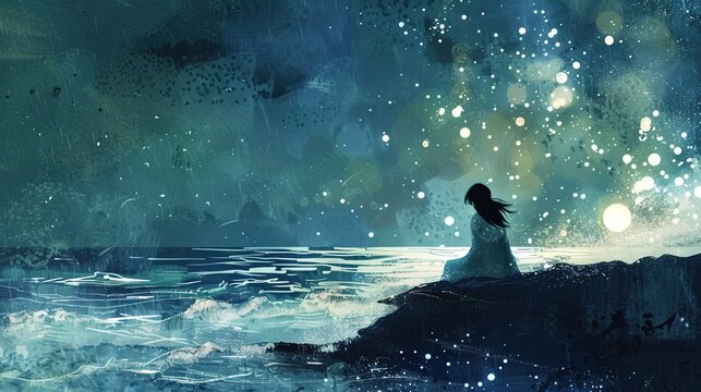 ChatGPT сказал:Woman standing by the sea with outstretched arms, facing the horizon, feeling the wind and freedom. She wears a white summer dress, her long hair flowing naturally i