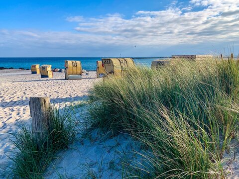 View of the sandy beach, traditional north german beach chairs and beach grass on the island Fehmarn on Baltic sea