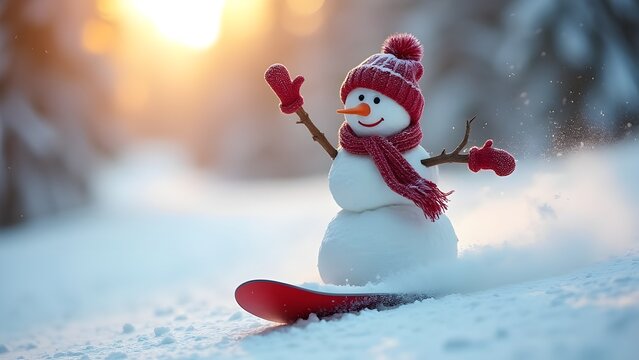 Inverno e neve: pazzo pupazzo di neve che fa snowboard