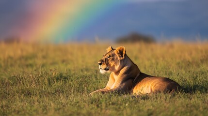 Female African lioness resting majestically in savanna grassland with vibrant rainbow arching across stormy sky at sunset, copy space