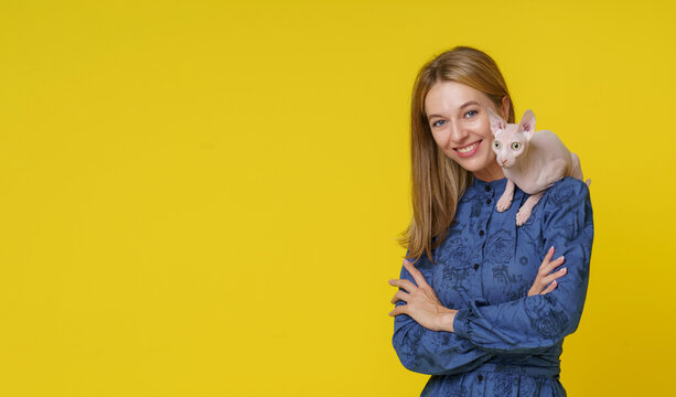 Smiling blond woman showcases unique bond with Egyptian cat Sphinx as it sits on shoulder against yellow background. Special companionship between woman and exotic feline friend, pet owner and cat.