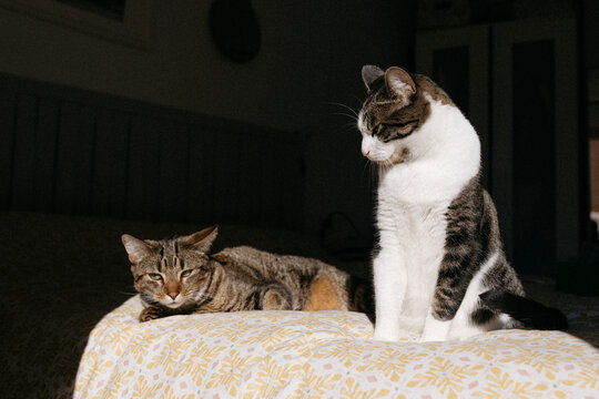Two cute cats nestled together in a cozy embrace, showcasing their playful bond and charming expressions. Perfect illustration of feline companionship and warmth.