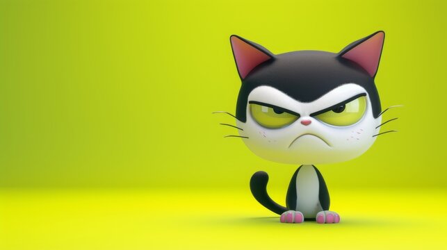 This 3D rendered cartoon cat displays an angry expression with narrowed eyes and a frown. The bright green background enhances the humor and character of the image, making it ideal for playful or