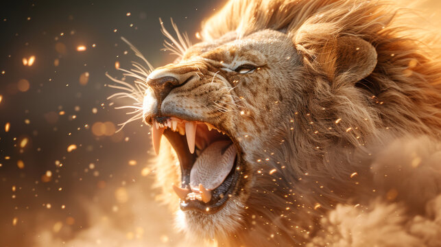 The power of majestic roaring lion and mane blowing in the wind in sparkle light