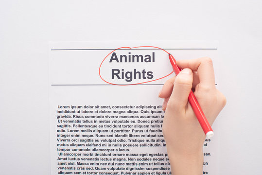 partial view of woman circling animal rights inscription with red felt pen on white background