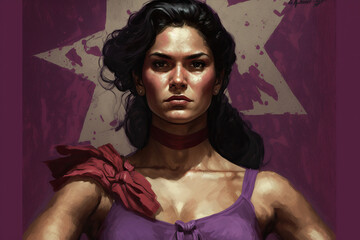 Generative AI painted illustration of confident female with dark hair in top standing against purple background with white star