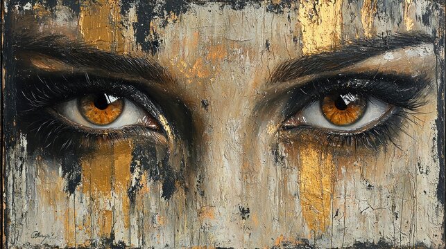 Close-up of expressive amber eyes, detailed brushstrokes, gold and black accents