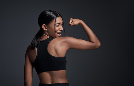 Female athlete flexing her arms