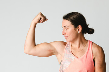 Close-up portrait of a muscular woman flexing her arm to show off her bicep
