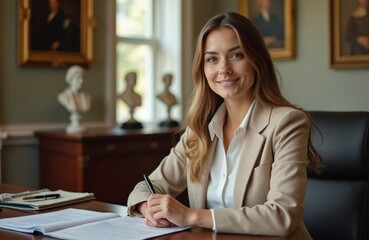 Portrait of smiling young female lawyer in law office. Woman at desk with legal documents, pen. Attorney, paralegal at workplace. Courthouse background. Pro occupation, civil court.