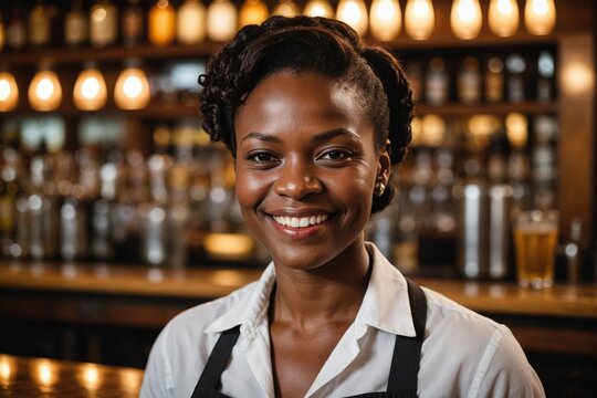 close portrait of a 40s smiling Zimbabwean female bartender against blurred bar background