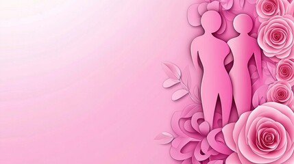 Two Pink Female Silhouettes on the Right Surrounded by Pink Roses and Leaves on a Light Pink Background, Suitable for Feminine, Love, or Women - centric Design Projects.