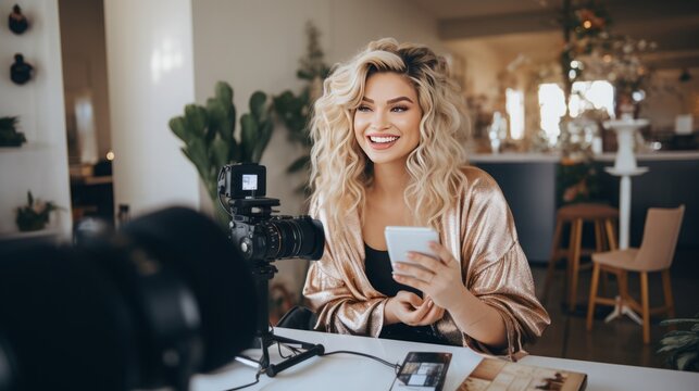 Young female influencer recording a video for social media, capturing her lifestyle and setting the latest trends. Female content creator, generative ai