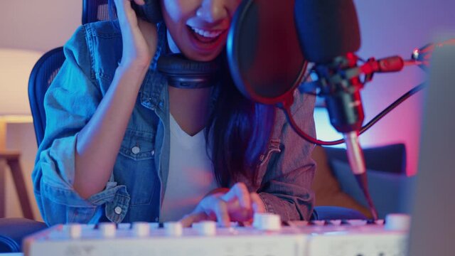 Young attractive Asian woman talking communicating during online live streaming how to cook homemade pizza indoor kitchen. content creator using camera recording food product review.