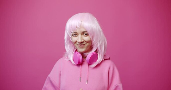 Static shot of cheerful young female in hoodie with wireless headphones and bright hair clenching fists and looking at camera with smile while celebrating success against pink background