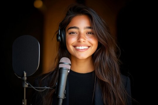 A cheerful female singer smiles brightly in a recording studio, showcasing her passion and enthusiasm for music with a professional microphone setup.