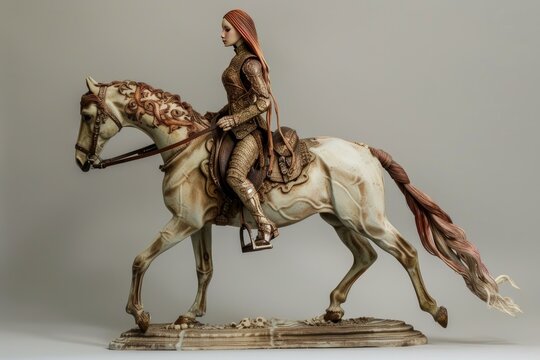 Elegantly crafted figure of a medieval female warrior riding a horse, displaying exquisite detail and artistry