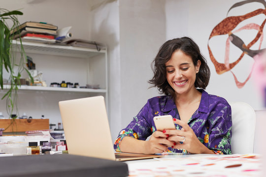 Female Artist Using Smartphone In Studio