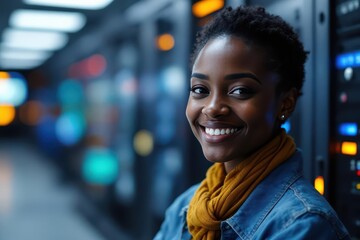 Black female technician in datacenter using IT app and internet for cybersecurity, software, and system upgrade.