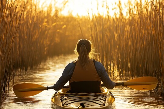 Lone female kayaker paddling through golden sunset waterway surrounded by tall reeds