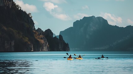 Kayaks Couple kanoeing in the sea near the island with mountains People kayaking in the ocean : Generative AI