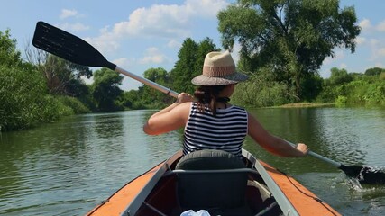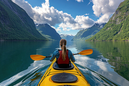 Woman kayaking on a lake with green mountains, nature landscape, summer activity