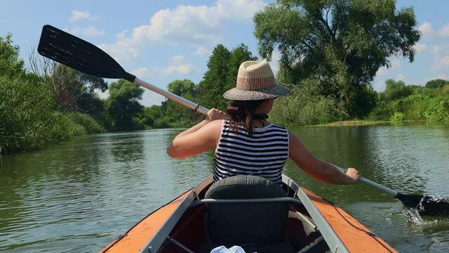 Kayaking and canoeing with friends. Girlfriends on canoe. Friends on kayak ride.